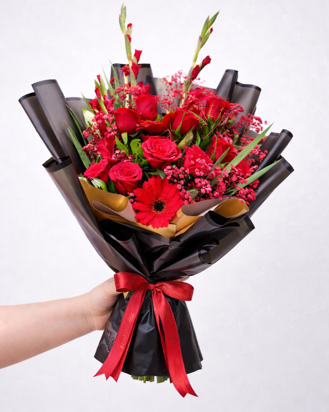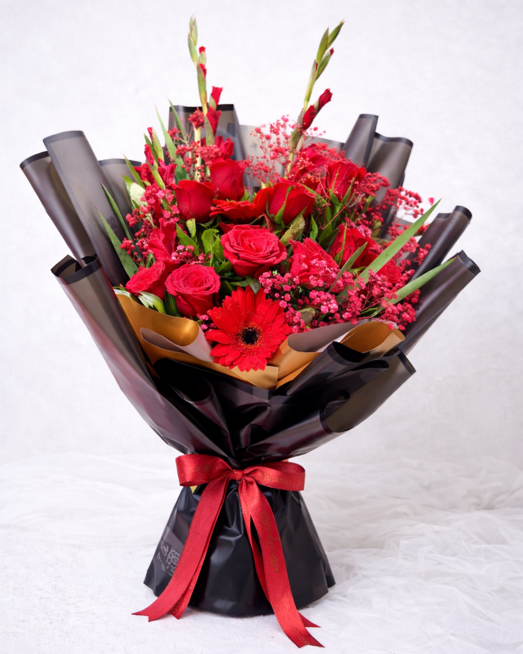 A vibrant mix of red roses, gerberas, and seasonal accents with lush greens. Expressive, celebratory, and full of movement.